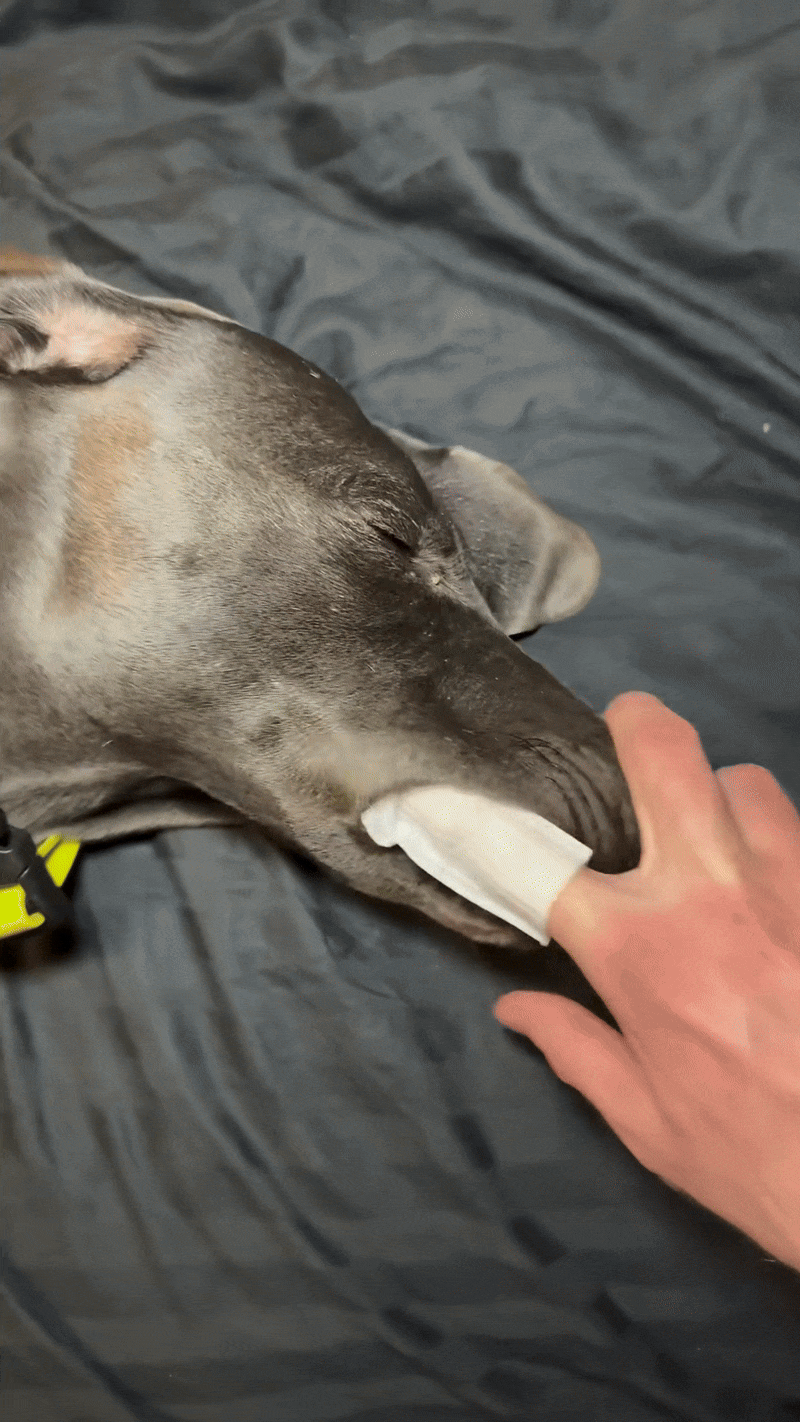 Déjale oler la toallita primero, empieza limpiando solo uno o dos dientes y premia su calma. En pocos días la mayoría de perros lo aceptan, e incluso se convierte en un momento de calma y conexión con su dueño.